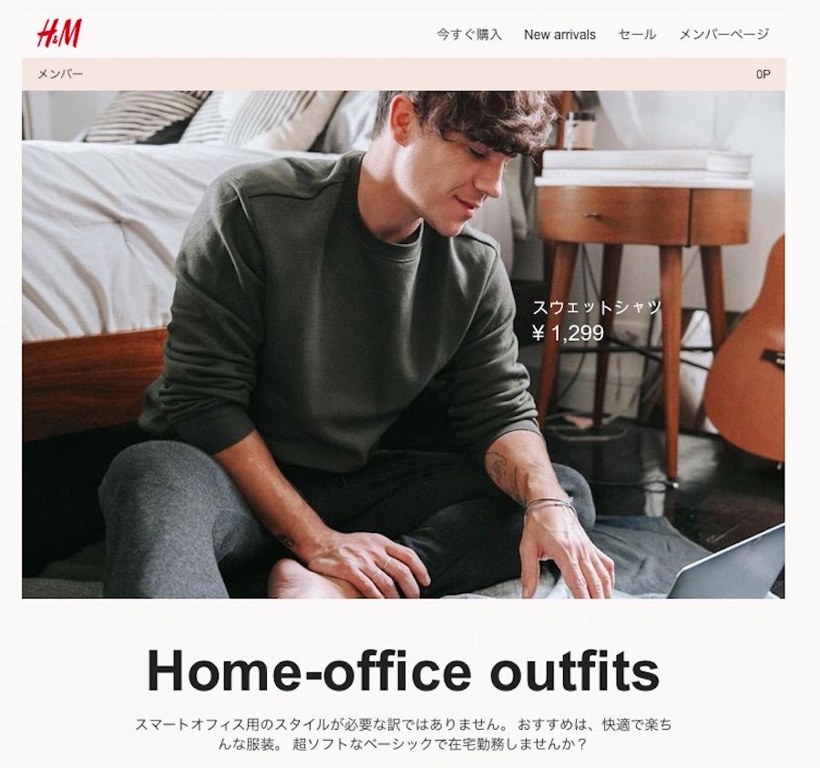 家に籠る上で生じるニーズへ対応した商品をECで販売するという取り組みです。この取り組みを行っているのはポピュラープライスのブランドやSPAが多いようです。H&Mはリモートワークにおけるファッションを提案。緊急事態宣言が出される5日前の4月2日には会員にメールマガジンを配信しています。ユニクロは、ルームウェアをアプリのトップページでハイライト。売れ筋モデルでは欠品が目立っており、ゾゾタウンのランキングでもスエットやジャージ、Tシャツが上位にランキングされており、同カテゴリーの需要が高まっていることがうかがえます。