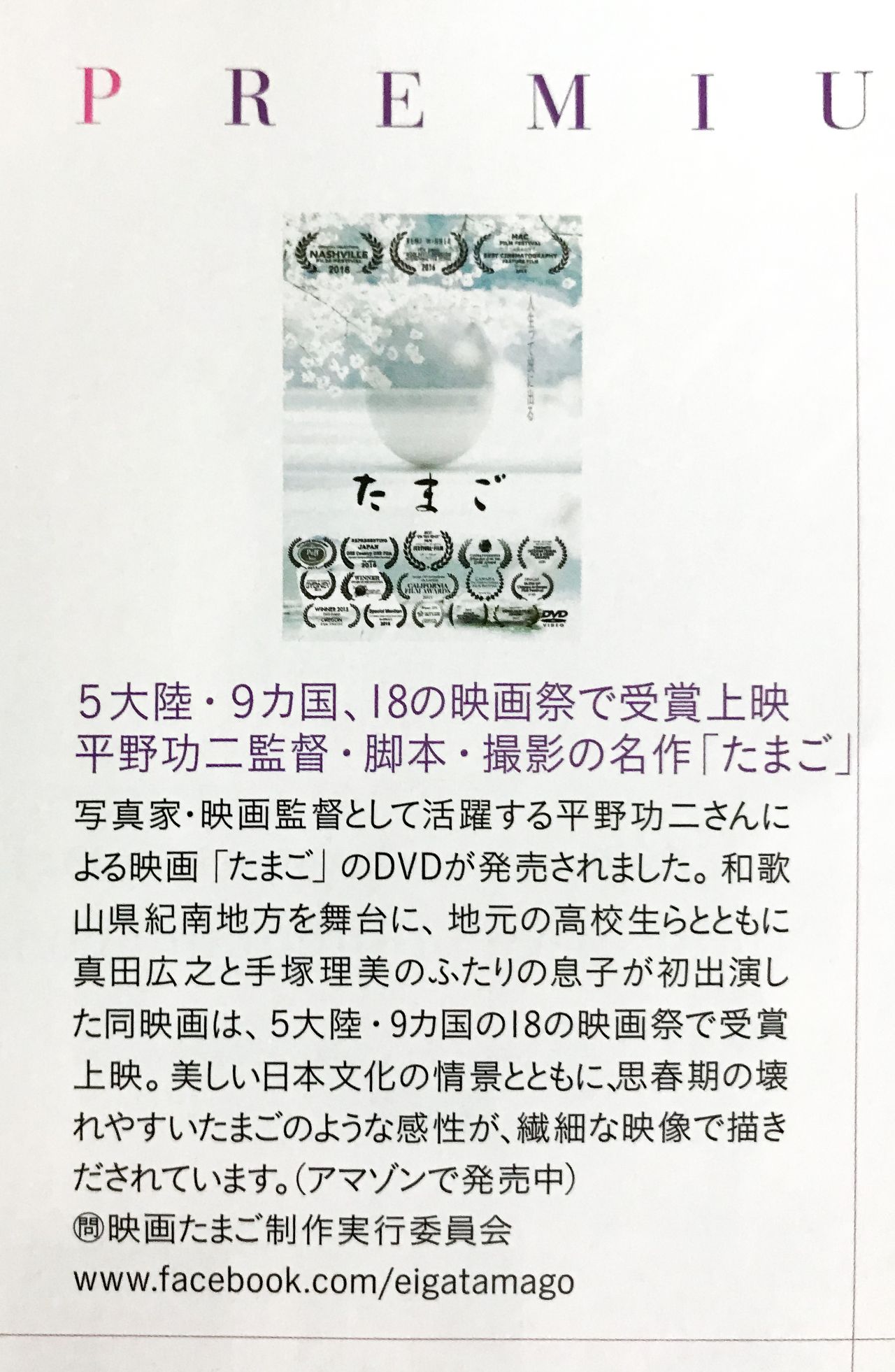 PREMIUM SELECTIONで映画「たまご」を紹介して頂いています