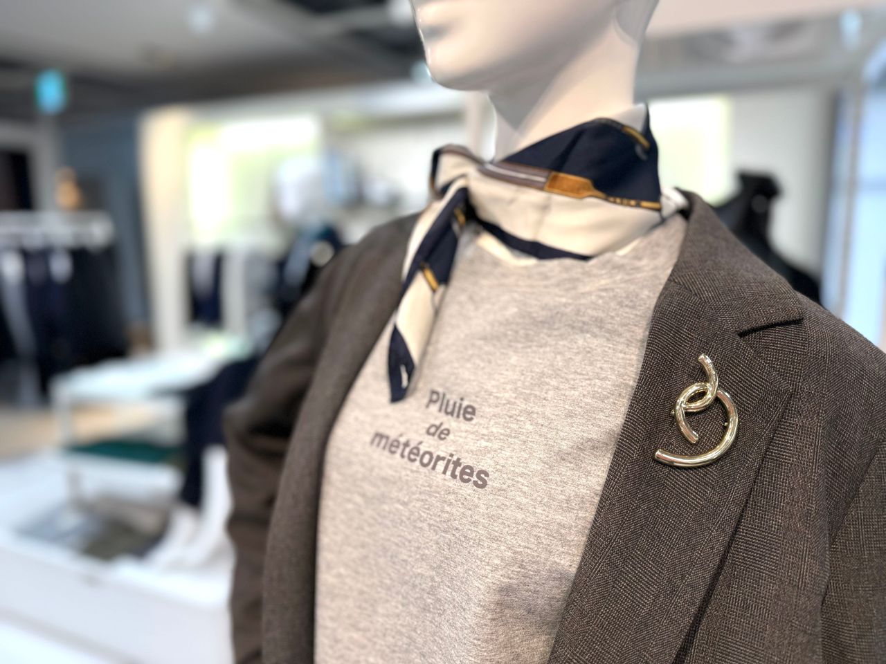 ジャケットスタイルはツイードにカットソー合わせでスカーフとブローチでアクセントを!
