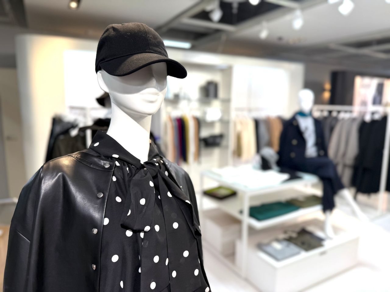 トレンドのフェイクレザー&デニムにハードになり過ぎ無いようにリボンブラウスのスタイリング。