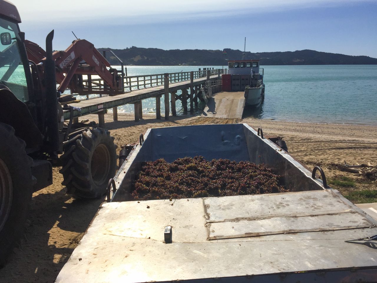 どんどん摘み終わったブドウが船で運び出されているようでした。