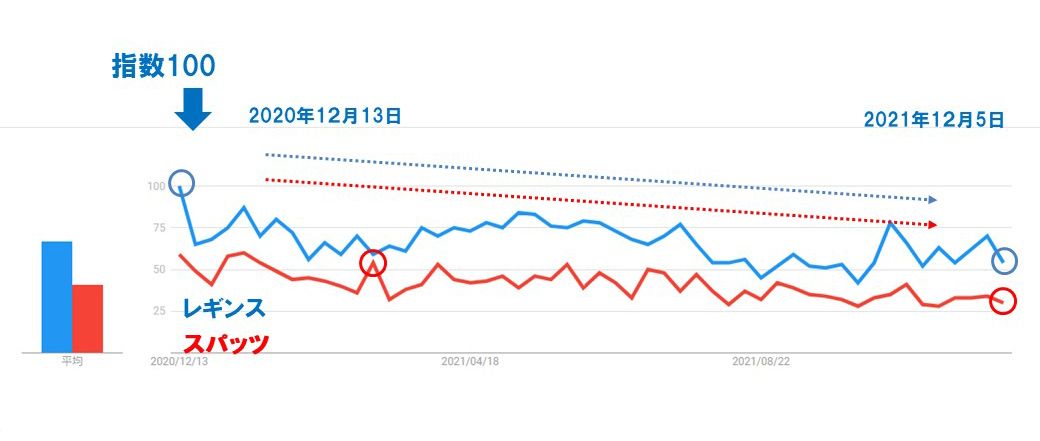 「レギンス」2020年12月13日を指数100とした場合、2021年12月5日時点は54で、約46ポイントダウン。