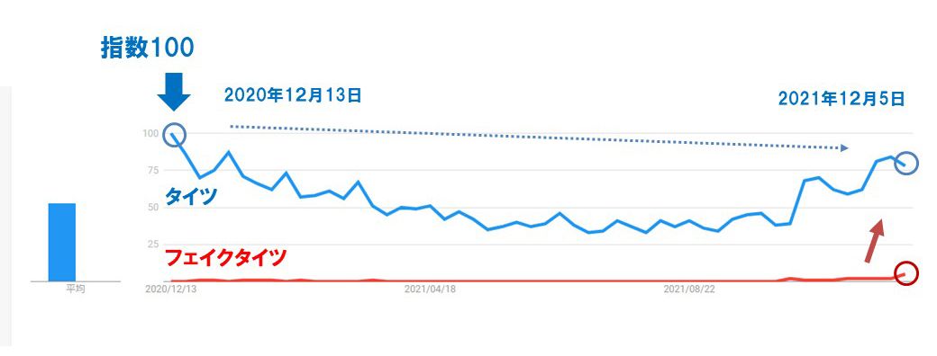 「スパッツ」2021年1月10日を指数100とした場合、2021年12月5日時点は50で、約50ポイントダウン。