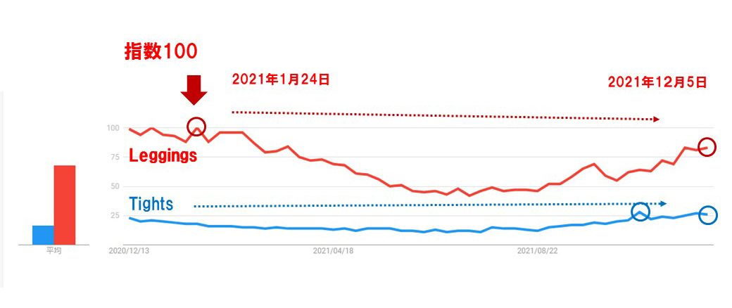 「Leggings」2021年1月24日を指数100とし、12月5日時点は83で、約17ポイントダウン。