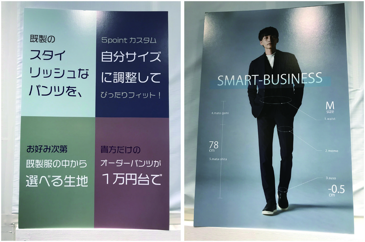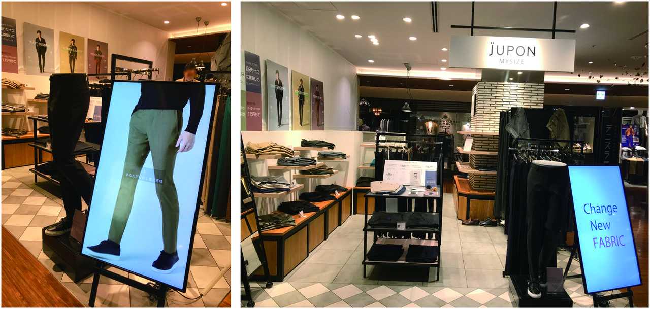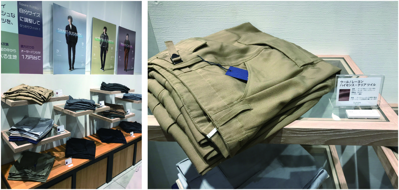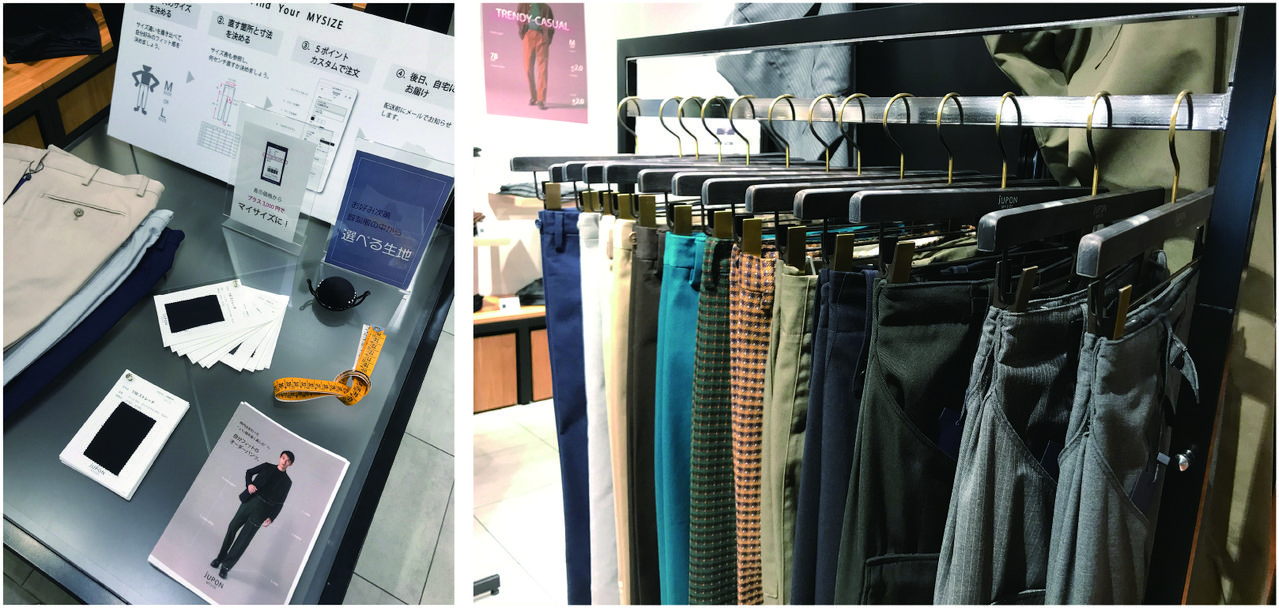 JUPON MYSIZE(ズボンマイサイズ )が提案する[5pointカスタムで簡単パーソナルオーダー]という新感覚の買い物体験をリアルの場で実感していただくストアで、 ブランド認知の他にマーケティングデータ等を収集することが主な目的でした。 体験型ストアでは既製服とマイサイズの両方が陳列されており、 お客様はその場で商品をお買い上げいただく事も出来ますし、 パーソナルオーダーで注文することも可能。 またプロのフィッターがお客さまのマイサイズ体験をお手伝いしました。