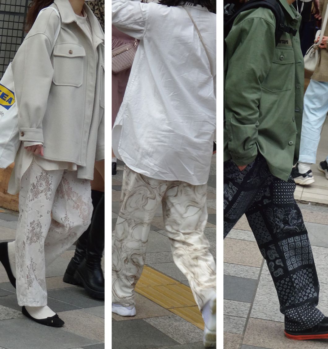 カジュアルシーンのドレス化傾向が見られます。スラックスの拡大がメジャー級だとすると、プリントパンツはマイナーです。出現率は男女合わせて1.9%。