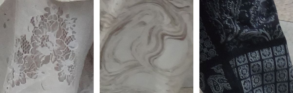 ポリエステル高混率のプリント素材に注目。今回は限られた柄の種類で、中世ヨーロッパ壁紙調、バンダナ・スカーフ調、迷彩調を確認。