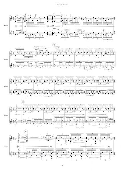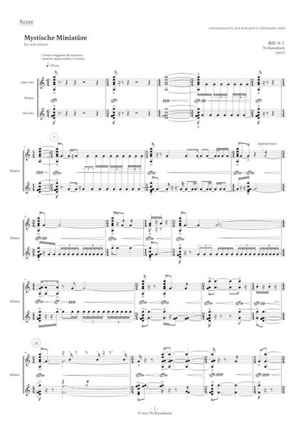 《Mystische Miniature》は、パウル・クレーの同名の作品からインスピレーションを受けています。この曲について考え始めたとき、私はルツェルンにいて、ローゼンガルト美術館でこのクレーの絵に出会い、東京に戻ってきてからも毎日そのポストカードを眺めていました。クレーのこの作品には、大きく数字の「1」が描かれています。ルツェルンでのアカデミーの合間をぬって、ラオスやタイに想いを馳せながらケーンについて考え、同じ時期に声明の作品の整理もして...、さらに、多くの大事な出会い、流れ込んでくる様々な国の様々な人たちの考えや感情、ぐちゃぐちゃのまま私のなかに積み重なった色々なものを全部まとめ、なんとかしてひとつの形にできたらと思いました。また、《Mystische Miniature》というタイトルは、ケーンのための作品にはぴったりだと思いました。ケーンという楽器自体が神様のようなもので、まさに《Mystische Miniature》そのものであるからです。