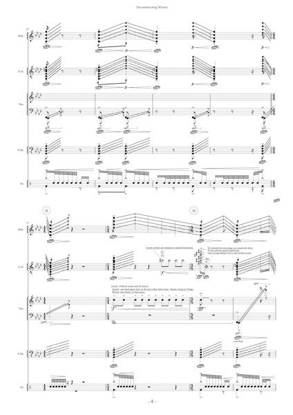 私の新作のタイトルは'Deconstructing Winter'ですが、この"Winter"は、ヴィヴァルディのヴァイオリン協奏曲集『四季』の「冬」のことです。「冬」をrecomposeした作品をと望月さんから委嘱をいただき、マンドリン、エレキギター、ピアノ、エレキベース、ドラムという、ちょっとロックな編成のために作曲しました。改めて「冬」を勉強し直し、これはやはり律動の音楽だなと感じたので、特にリズムや拍子で遊んだ作品となっています。第1楽章を中心に、全楽章の要素を使用しています。当初はもう少しバンドらしい曲にするつもりでいたのですが、書き始めるとそうは問屋がおろさず、変拍子満載、ベースもドラムも自由にできるところはほぼなく、全てのパートに