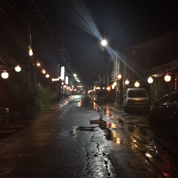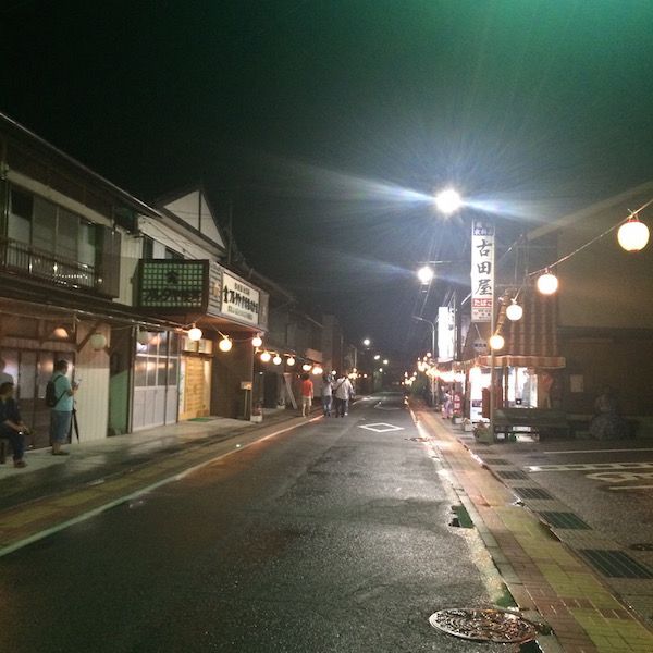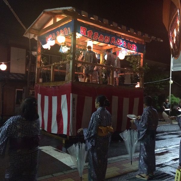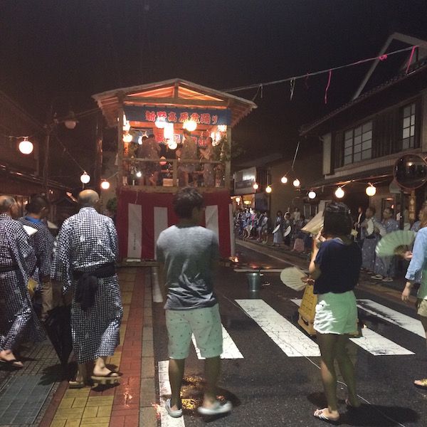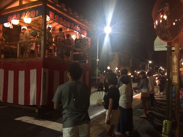到着した時は雨がかなり降っていました。雨天決行だそうで、傘をさしながらの盆踊り。やがて雨がやむと、夜中にもかかわらず人がだんだんと増えて輪が大きくなり、盆踊りらしくなってきました。