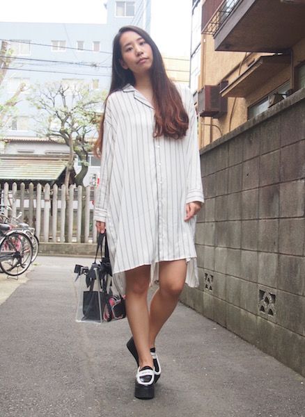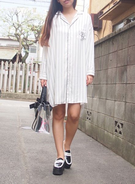 It was coordinated with ribboned transparent bag and bi-colored leather mocassins to fit street cloths.