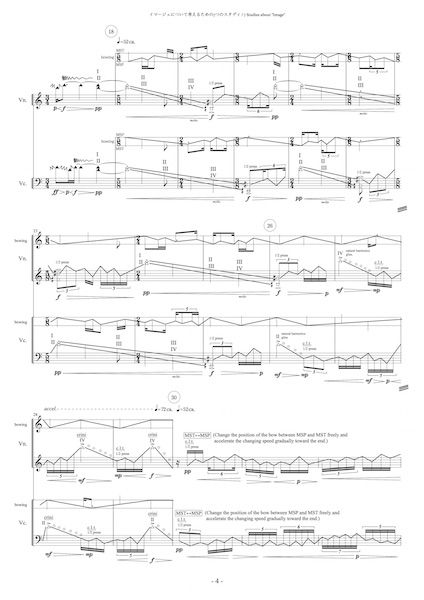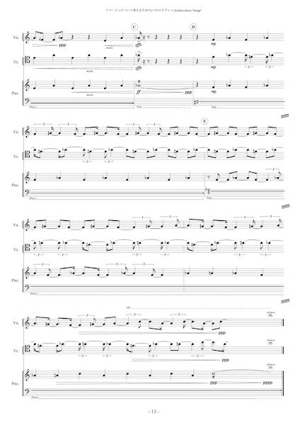 《イマージュについて考えるための7つのスタディ》は、7つの違う性格を持った小品で構成されています。昨年は特に多くの作品を書き、自分なりの書法を更に探っていくためのいくつもの発見がありましたが、響き、ジェスチャー、そして音楽の作り方が一様になってきてしまったように感じています。それを打開するため、新しいアイディアを多く出してみようと思い、アイディアのカタログとして作品を構成することにしました。「イマージュ」は、アンリ・ベルクソンの『物質と記憶』に出てくる用語です。『物質と記憶』をわからないなりに少しずつ読み進めていくなかで得た発想を、今後、如何に音をエネルギーとして構築するか、如何に時間を構築するかに結びつけていきたいと思っています。