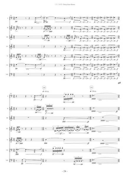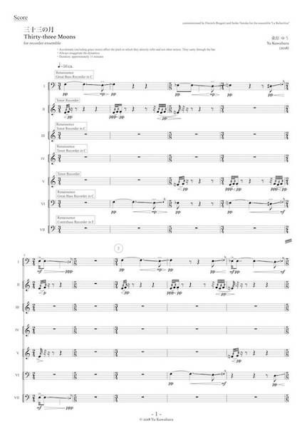 “これまでに「月」をタイトルに付した作品をいくつか書いていますが、そのどれもが「すべる」音=グリッサンドにフォーカスしています。草野心平『河童と蛙』に「河童の皿を月すべり。」という一節があり、子供のころに読んだこの詩の印象があまりに強く、「月」というと、どうしても「すべる」という動詞がセットになって連想されます。《三十三の月》もリコーダーの「すべる」音に重点を置いた作品です。タイトルは中尊寺での如意輪講式のテキストから引用しました。観音さまは、あらゆる人を救い、あらゆる願いをかなえるため、場合に応じて三十三種類のお姿に変身されるそうで、「三十三の月」はそれに基づく一節なのだそうです。タイトルの通り、ある四小節のまとまりが少しずつ変化しながら三十三回繰り返される(作曲のプロセスでその構想から外れてしまったところもありますが)あいだに、「水」に基づいた別の要素(私にとって、「水」も「月」から連想するイメージのひとつです)が挿入され、音楽が展開されていくよう作曲しました。”