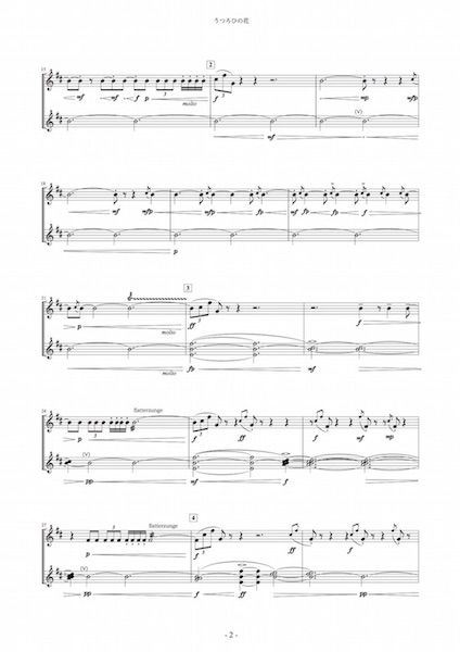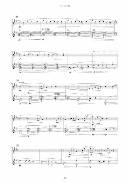 《うつろひの花》は3年前に古山先生に委嘱をいただき、調性であまり難しくなく聴ける作品ということで作曲しました。リコーダーと笙の組み合わせで音を想像したとき、笙の音はどこまでも広がる空と緩急をつけて流れる風、リコーダーの音はその空間を飛んでいく鳥たちのさえずり…というイメージを持ちました。鳥のイメージは、現代音楽のフィールドではもう使い古されたようなものだとは思うのですが、結局その最初のイメージを払拭することはできず、それならむしろ、メシアンや他の作曲家たちにならって、鳥の鳴き声をそのまま音の素材にしようと思いました。4月の初演が予定されていたため、春の鳥といえばうぐいすだろうと、うぐいすの鳴き声を音に写し取り、それを様々に変奏しながらメロディーとしました。また、古今和歌集の「うぐいす」をふくむ和歌から「うぐいすの なく野辺ごとに きてみれば うつろふ花に 風ぞ吹きける」を選び、そのイメージで全体を作曲し、「うつろふ花に」を少し変化させてタイトルとしました。私なりの、音による「本歌取り」といった感じの作品です。たしか初めてPCでスコアを作った作品で、Finaleと挌闘しまくったのもとても懐かしいです。
