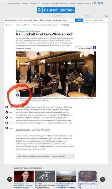 ドイツの公共放送ラジオ Deutschlandfunkにて、私の作品と活動がおよそ1時間にわたって特集されました。番組名は《Die Komponistin Yu Kuwabara - Neu und alt sind kein Widerspruch 》、直訳して「作曲家 桑原ゆう、故きと新しきは矛盾しない」です。上記リンクで1週間、アーカイブ音源が掲載されています。(既にアーカイブの掲載は終了しています。)