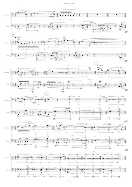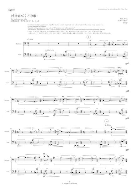 日本の言葉ならではの歌を作曲することについて、声明や能、落語などとの貴重なコラボレーションの経験を通し考え続けている。《浮世忍びくどき歌》は、歌と三味線の関係性をバリトンとチューバで翻訳するように作曲された。端唄や三味線組歌などを聴くと、ここに三味線が入り、歌がこう入ってくる…なぜだろうと、未だ腑に落ちないことが時々あり、それを少しでも解明したいと思った。テキストには江戸初期の流行歌謡を集めた『淋敷座之慰(さびしきざのなぐさみ)』から「忍びくどき木やり」を用いた。囃子言葉や擬音が多く出てくるのが面白い。毎小節のように拍子が変化し、バリトンには度々四分音が指定されるという複雑さだが、微妙な抑揚やふしの揺らぎを表現するためで、あくまでも自然に流れて聴こえるよう気を配った。同時期に並行して、隆達小歌をテキストとした作品(こちらでも松平さんにお世話になります)が作曲されていて、相互に関連している。