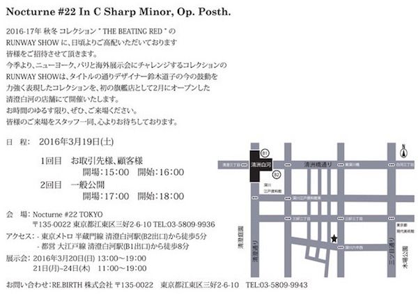 今年もこの時期になりました。以前ヨウジヤマモトのワイズレッドレーベルでデザイナーをされていた鈴木道子さんのブランド「Nocturne #22 in C Sharp Minor, Op. Posth.」秋冬コレクションのランウェイショーです。