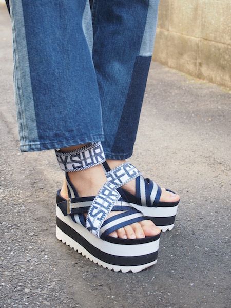"CITY SURF" is the theme of 2015 SS Collection at G.V.G.V., that is my favorite Tokyo fashion brand. These sports sandals in today's my look are iconic items represent their theme. I love everything about them: the sporty-looking belts with the message "CITY SURF" and voluminous shark soles with white and black stripes. Today I made a breezily and summerly look with them attached as the lead roles in shades of white to blue.</色></中>