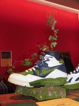個人が最も手軽にできるのがモノの再利用だろう。古着やかばんなどのリメークは一般的だが、イセタンメンズの18秋冬展では、プランターに再利用したシューズ(写真)を見掛けた。単に植物ポットを入れるだけでなく、デザインに合わせて靴に苔のようなものが……。「さまざまな制約で販売はできないが、オブジェのように活用しサステイナブルを表現したい」と言う。