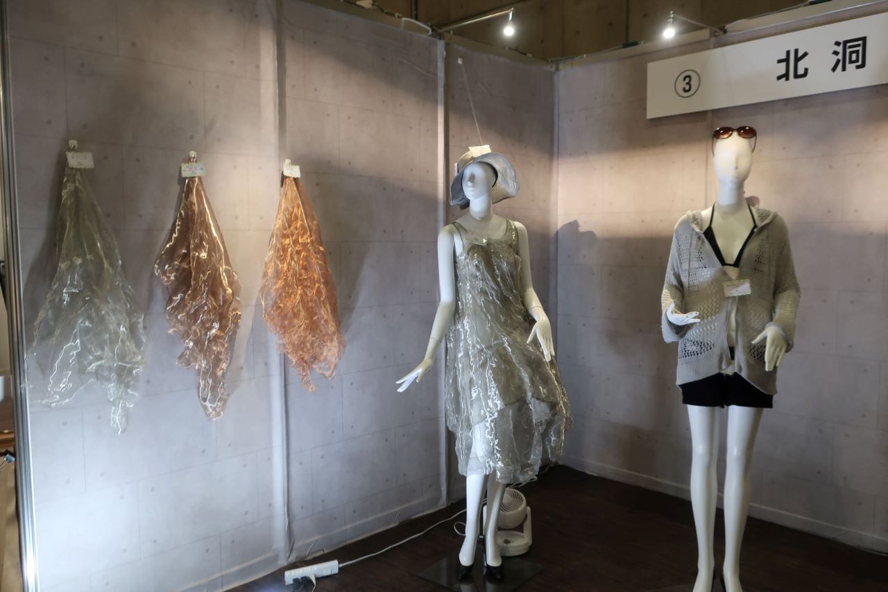 北陸ヤーンフェアは「サステイナブル&ファンクション」をテーマに開催され、エコ素材の提案が目立ったが、同社はファッションに重点を置いて展示した。その中でもステンレスを使った織物が注目を集めたそうだ。