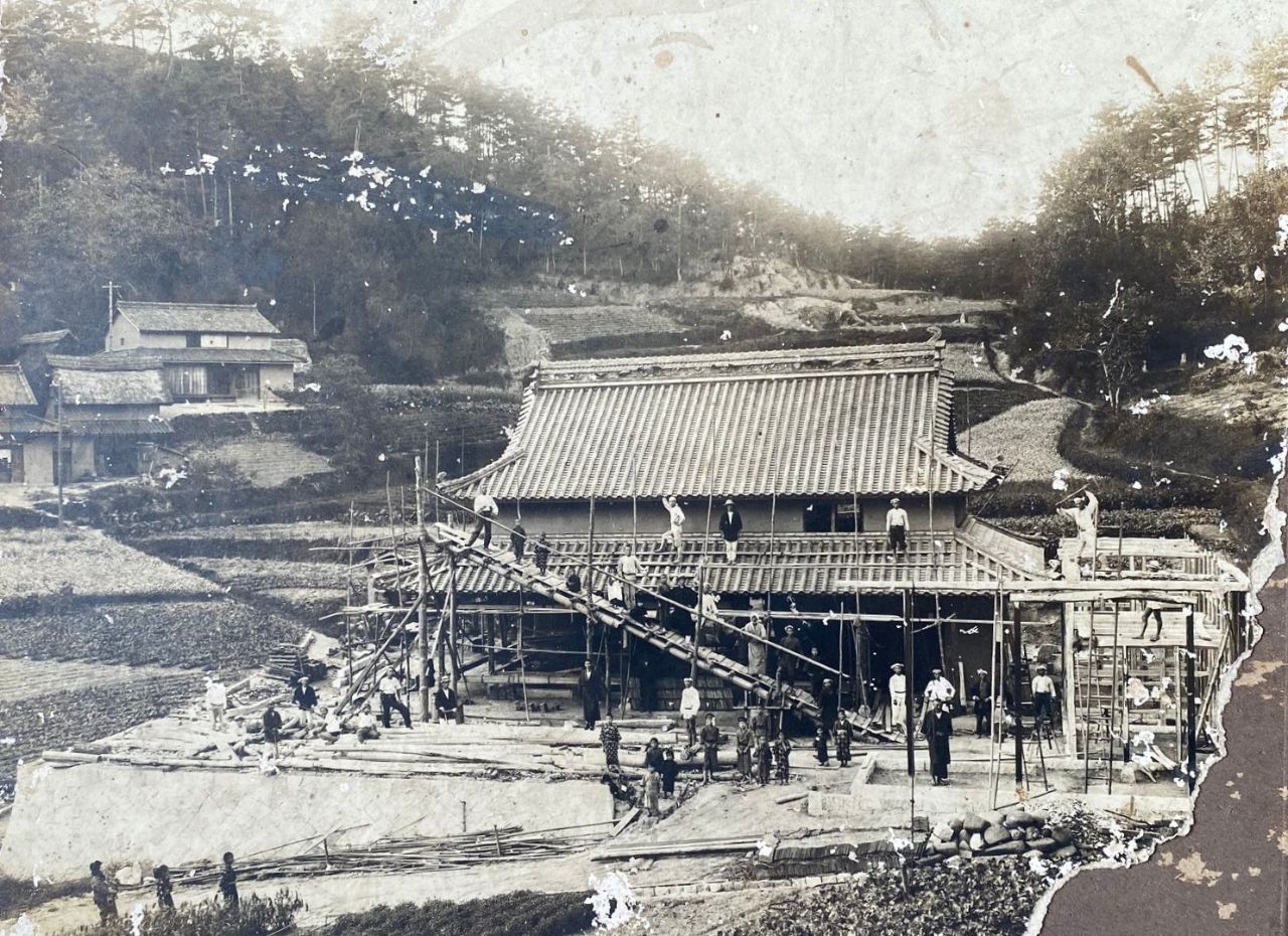 【中国・四国支社】「100年前の写真が出てきた」と、デニム製造の日本綿布(岡山県井原市)の川井眞治社長が見せてくれたのがこの写真。川井社長が現在も暮らす築100年の家が建築されている時の写真で、「瓦をふき替えようと思っていたタイミングで、家の中を整理している時に出てきた」と言う。木の足場や職人のいでたち、当時の服装など、現代のような機械もなかった時代の家作りの様子を写真は鮮明に伝えている。何の気なしに撮った写真も長い時間を経ると重要な資料になるのだと感じさせられる。(秋)