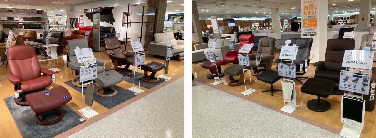 【東京本社】理想的なすみ分けと言えるだろう。ニトリとホームセンターの島忠による初の融合型店舗「ニトリホームズ宮原店」(さいたま市)では、両社が扱う家具を価格帯ですみ分ける。NB主体の島忠は中高級品、ニトリは低価格のPBをラインアップした。象徴的なのがパーソナルチェア。通路を挟んで一方にニトリPB(写真・右、2万~6万円台)、もう一方に島忠がそろえたNB(同・左、20万円前後~30万円台)が並ぶ。在宅ワークが盛んな中、両社の強みを生かしあらゆる客を取り込もうとの気概を感じる。(直)