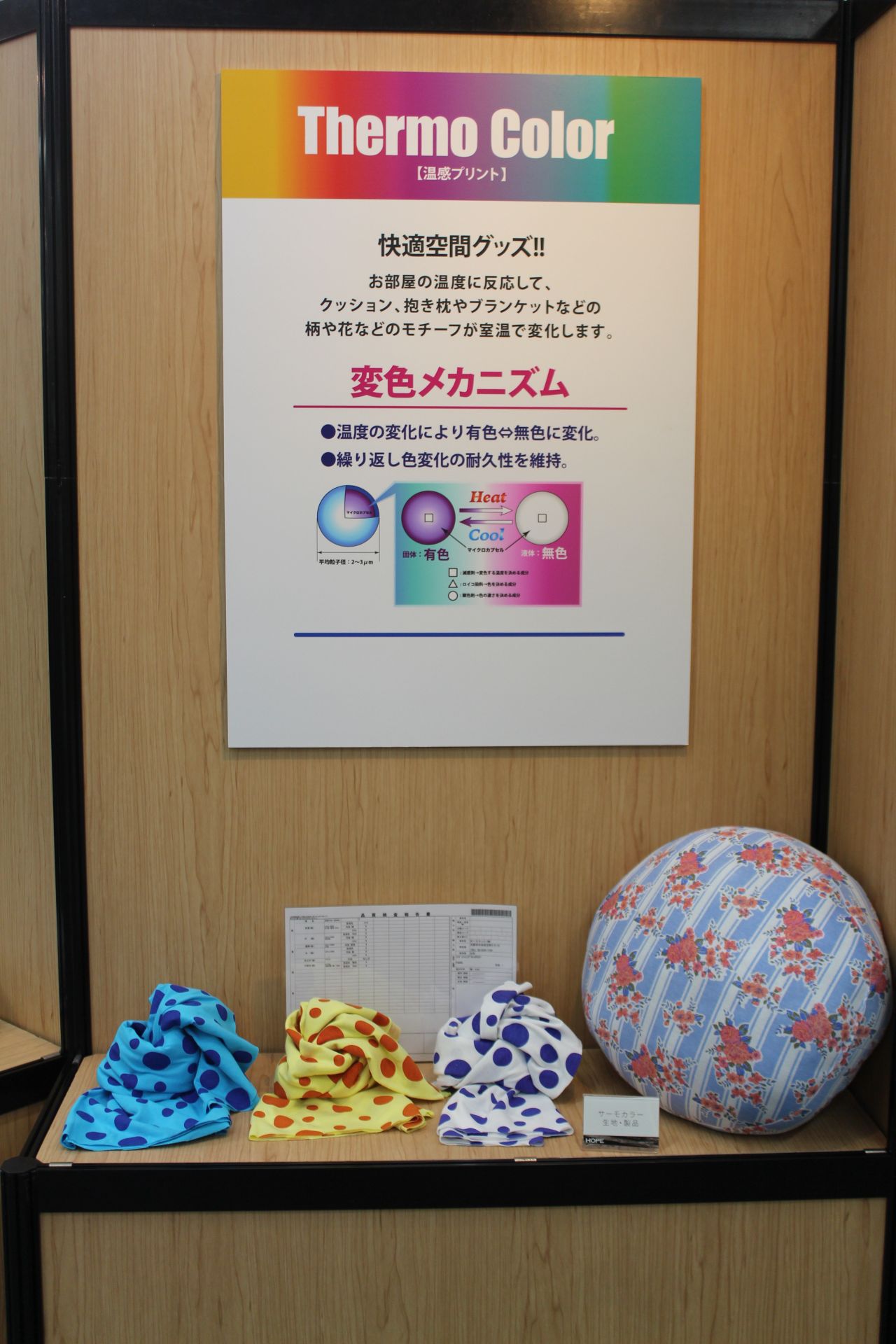 もう一つ。特殊な染料を使うことで温度変化により色が変わるというプリントだ。実際に色がどのように変わるかを実験で見せてもらったが、なかなか変化はドラマチック。花柄のクッションにドライヤーを近づけるとみるみるうちに柄が白くなった。応用すれば最適な温度で美しい柄になるインテリア製品も可能という。