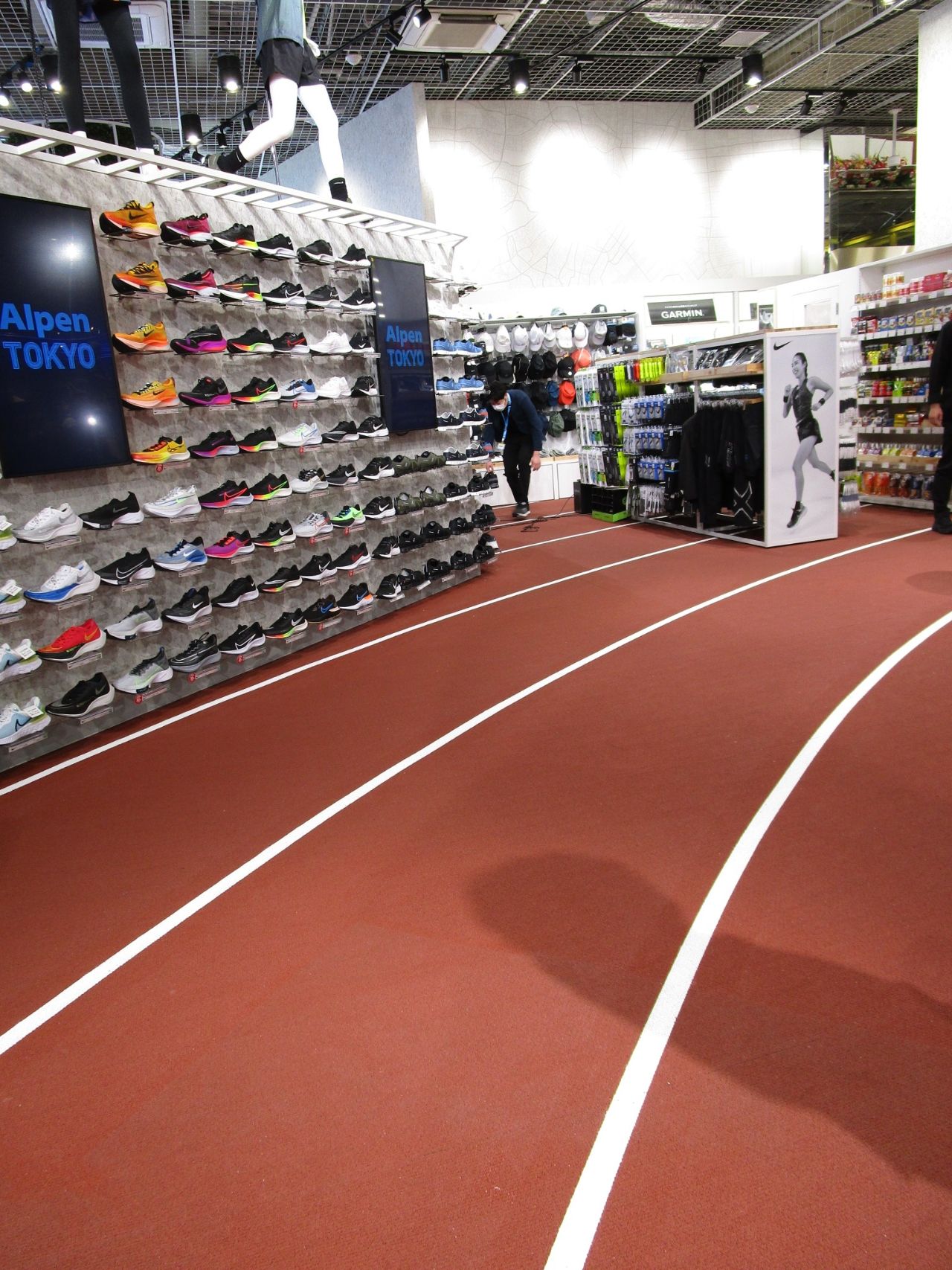 【東京本社】新宿駅東口近くに今月オープンした「アルペントーキョー」。スポーツ用品販売のアルペンが展開する「スポーツデポ」「アルペンアウトドアーズ」「ゴルフ5」3業態それぞれの旗艦店を集めた同社最大級の店舗だ。水野敦之社長は開店に当たって「ECでなんでも買える時代だが、それだけではスポーツの魅力を伝え切れない。リアル店舗ならではのワクワク感を感じてもらいたい」とコメント。ランニングシューズ売り場には新国立競技場の陸上トラックに採用されたイタリア・モンド社製の表面材(写真)を採用し、サッカースパイクの試し履きスペースには有名スタジアムと同様のレカロシートを設置している。リアルならではの体験を重視した工夫を凝らす。(日)