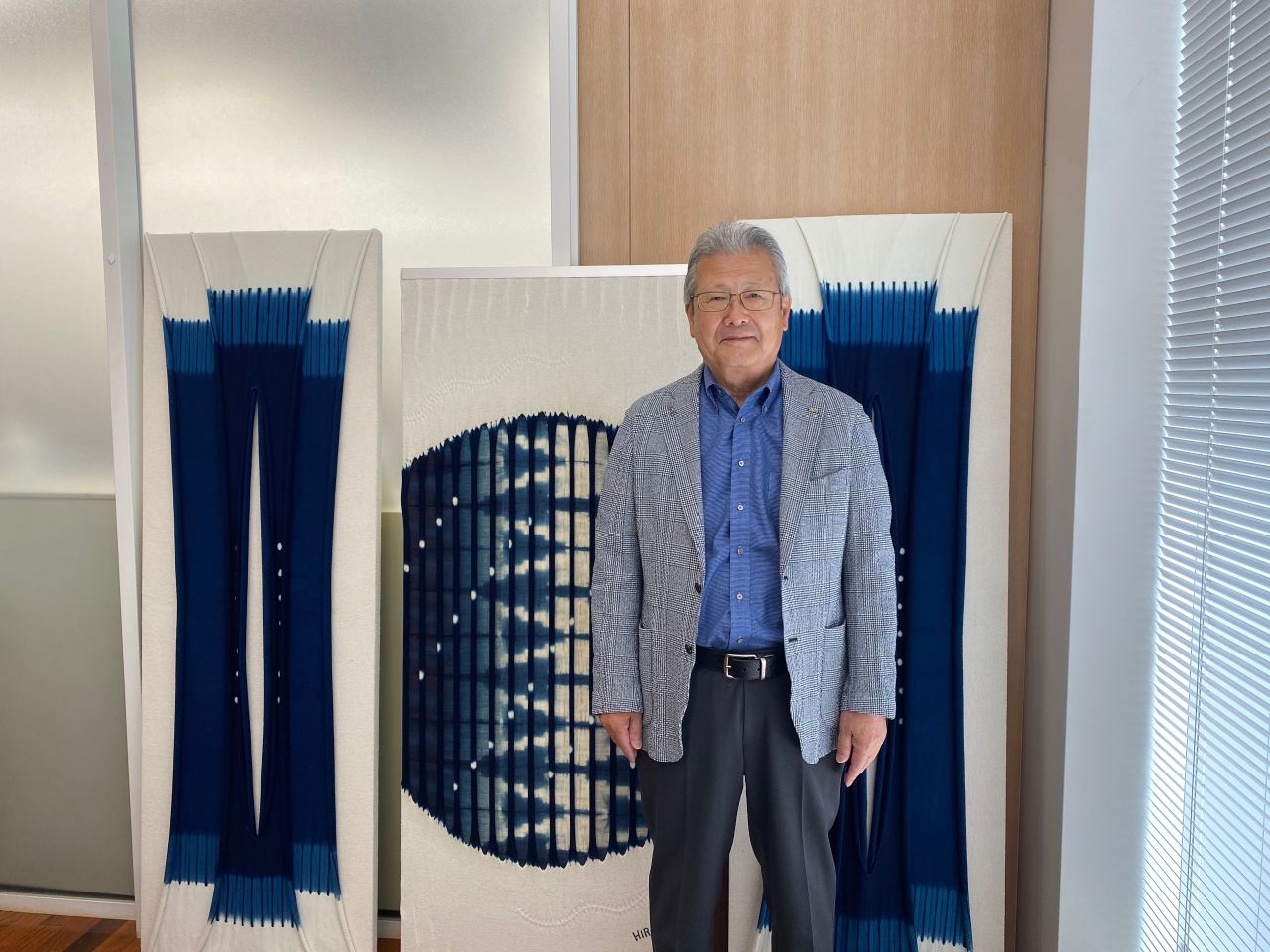 【中国・四国支社】オフィスウエア製造卸のセロリー(岡山市)で、目に飛び込んできたのが藍絞り染めのアート作品。京都の藍染め作家、小川裕惠さんの作品だそうだ。2004年に社屋「セロリーレソルテ」を竣工した時に小川さんの作品を社内に飾っていたが、18年の時を経て色が褪せてしまった。そのため、このほど新しい作品を譲り受けた。「最近、朝礼の話題が新型コロナウイルスやウクライナ侵攻など暗い話ばかり」と太宰幹夫社長(写真)。少しでも明るくなればとこの作品を並べて朝礼を行った。リモート先の画面にも奇麗に写っていたそうだ。作品が場の空気を爽やかにしてくれたかもしれない。(秋)