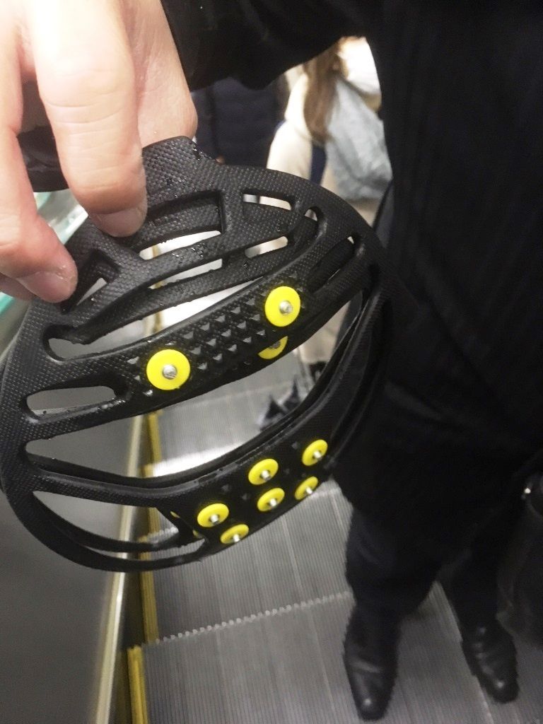 エスカレーターで、革靴の底にワンタッチタイプのスパイクを着けていたサラリーマン風の男性。