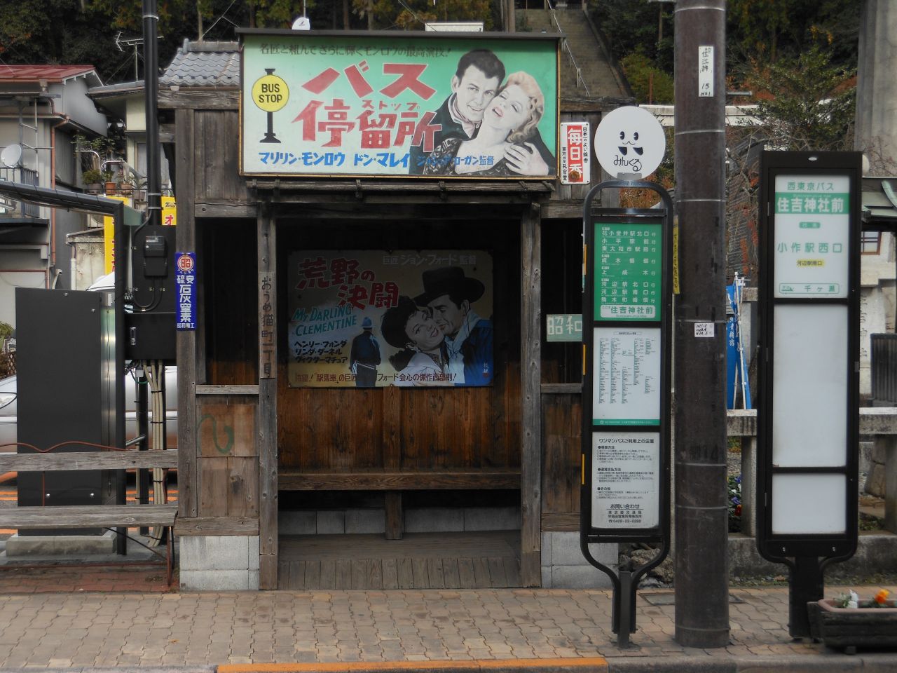 街を歩くとバス停もなんだかレトロな雰囲気。取材先に話を聞くと、青梅はかつてタオルの5大産地の一つに数えられるなど繁栄し、美術館や映画館も多かった。戦時中には作家の吉川英治さんが疎開していたらしく、吉川英治記念館も存在する。映画看板絵師の久保板観さんの出身地ということもあり、昭和レトロな映画看板で青梅駅周辺を盛り上げている。