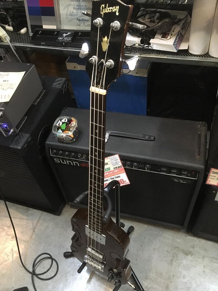 写真のベースは約50年前のモデル。試奏すると適度に枯れているのに、腹に響く低音。まさにビンテージ、現行品とは比べ物にならない。お値段は30万円でした。(周)