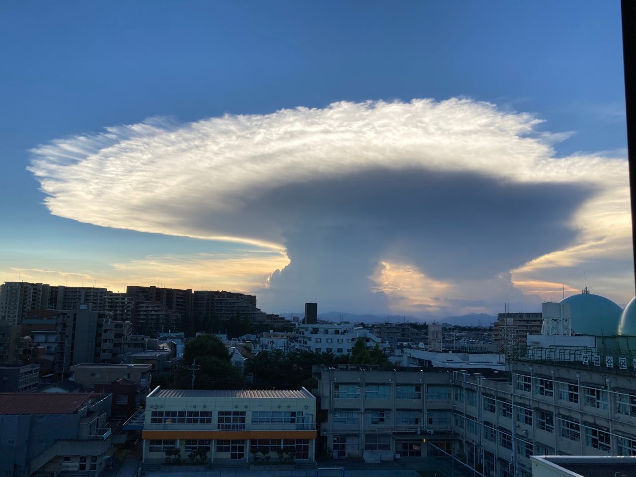 【東京本社】テレワーク中のある夕暮れ時。原稿を書き終え窓の外を見ると、巨大なキノコのような雲(写真)。天気がキーワードになったアニメ映画を彷彿とさせる。はじめ軸の部分は2本あったが、カサの方へ吸収された。入道雲ともいわれる積乱雲の変形版かと思い、夕立や雷を警戒したが、放射状に静かに空へ溶けた。世界気象機関によると、雲は10種類に分類されている。夏の晴れた日に空にぽっかり浮かぶのは積雲(通称わた雲)だそうだが、それとも違う印象。わた雲同士がくっついてできたのだろうか。梅雨時、全面雲に覆われた空を心配そうに見上げるだけでなく、晴れたときこそ見上げてみよう。(直)