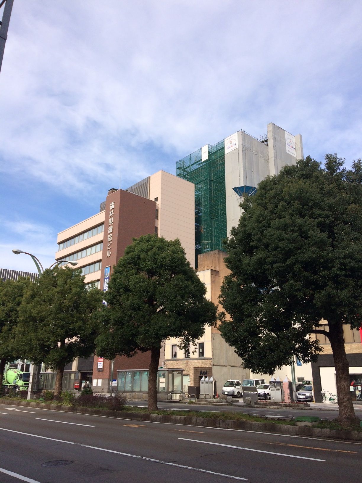 【大阪本社】1年振りに福井を訪れた。福井県繊維産業のランドマークである、福井県繊協ビルの建て替え工事が進んでおり、驚いた。2021年7月末に完成する予定という。旧駐車場部分に福井県繊協ビルを建設中で、そこがオフィス棟となり、完成後に現オフィス棟を取り壊し、ホテルになる。