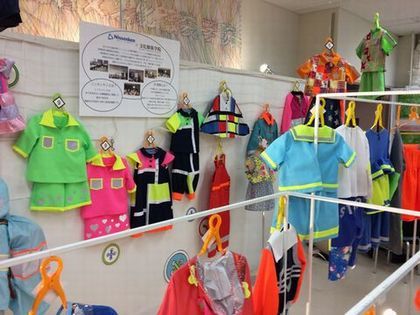 写真は東京都内のデザイナー学校の文化祭での光景です。非常にかわいい作品が並んでおり、この季節に子供たちに着せれば事故対策になるのではと思う。