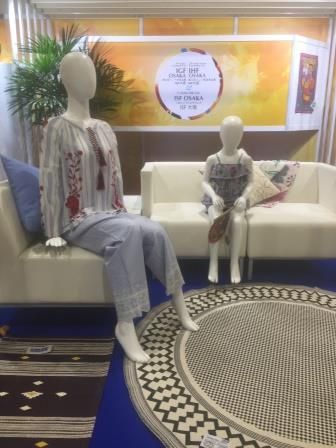 会場内は打って変わって空調が効いており快適そのもの。インドの衣料は、薄地の綿素材が涼しげで印象に残った。ロングワンピースは、シルエットもゆったりしてリラックスした雰囲気。レースや刺しゅうを全面に施したブラウスやポンチョなども多く見られ、装飾的な意味だけでなく、風通しを良くする工夫があるように思えた。