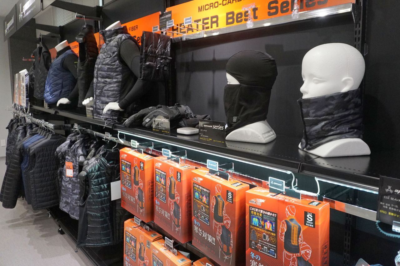 【中国・四国支社】最近、急速に普及しつつあるのが電熱式保温(EH)ウエア。筆者も昨年、物は試しにと地元の作業服店でベストを1着購入し、ネット通販で買ったバッテリーと組み合わせて使用した。部屋着としてほぼ毎日使っていたが、あまり部屋の暖房の温度を上げずに済み、動いていると逆に暑くなるほど。冷え性の女性にも有効的ではないかと感じた。ワークウエアメーカーの21秋冬展の傾向を見ていても、EHウエアの新商品が目立つ。いくつかの企業はパッケージ化し、まだ使ったことがない人も買いやすい(写真)。「敬老の日に合わせプレゼントするケースも増えている」とアタックベース(広島県福山市)の担当者。なるほど、今年は自分も親へプレゼントでもしようか。(佑)