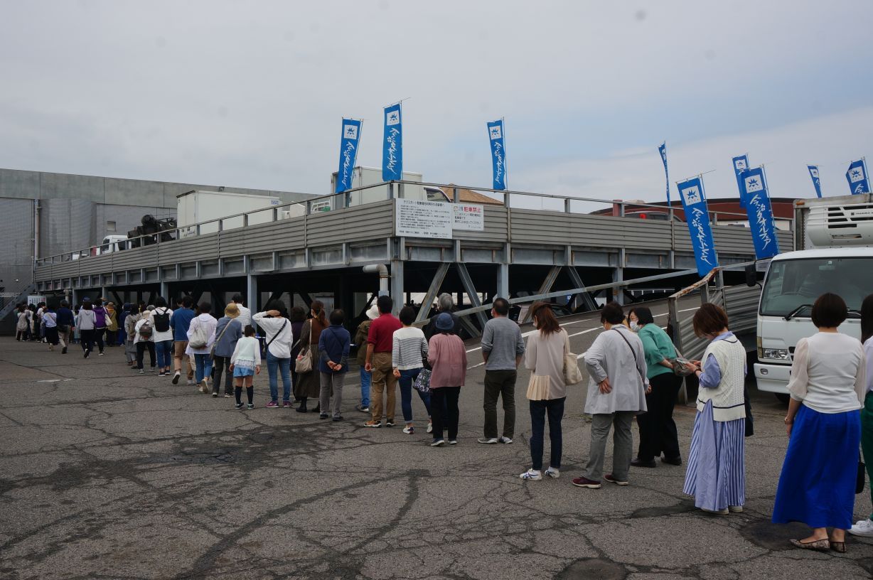 【大阪本社】タオルの合同販売会「今治タオルフェア」取材のため週末、今治産地へ行ってきた。開催は2年半ぶり。前日は雨だったが当日は上がり、9時の開門前から多くの来場者が列を作った。今回は入口と出口を分け、来場者カードの記入、手指消毒、検温など感染防止対策を徹底。ソーシャルディスタンスを取りながら並んだこともあり、列はさらに長くなったようだ。ただし会場内は“密”にならないよう余裕を持ってブースを配置、入場制限を行ったことなどもあり、新型コロナウイルス禍前のような「立錐の余地もない」ということはなかった。一方で、大きな袋にたくさんのタオルを詰めて歩く来場者の姿に、購買への変わらぬ熱量を感じた。(酒)