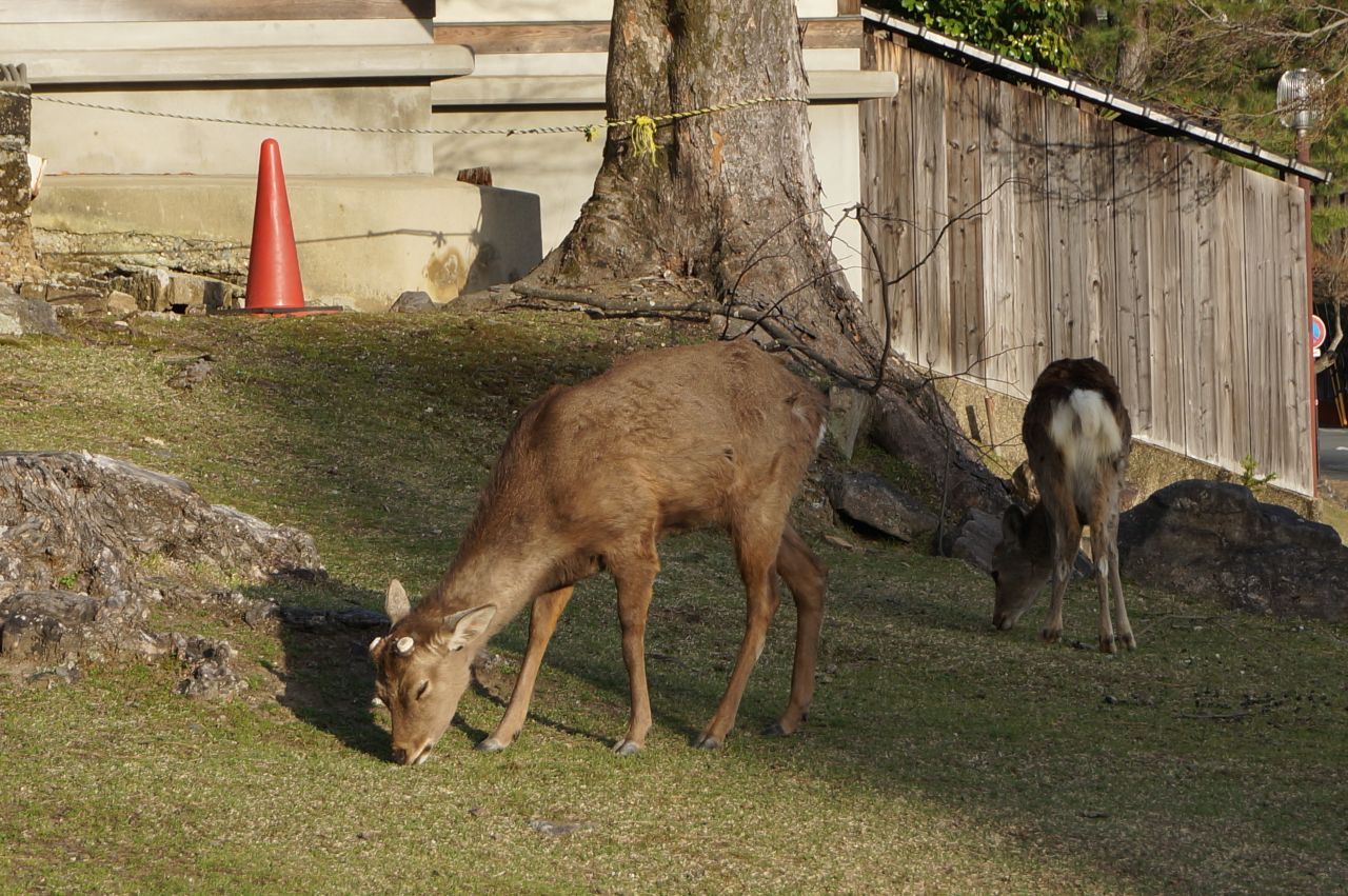 【大阪本社】奈良県での取材からの帰り、市内の猿沢池のそばを通りかかると鹿がいた。奈良だから鹿がいるのは普通だ(という感覚がおかしいかもしれない)が、繁華街に近い、この場所で見るのは初めて。悠々と道端の草をはんでおり、むしろ人間が遠慮する雰囲気があった。新型コロナウイルス禍で観光客が激減し、この辺まで出歩きやすくなったのかと思ったが奈良県民によると、それほど珍しいことでもないらしい。ただ、柵もおりもないところで対峙(たいじ)すると緊張するのは筆者が大阪府民だからか。(酒)