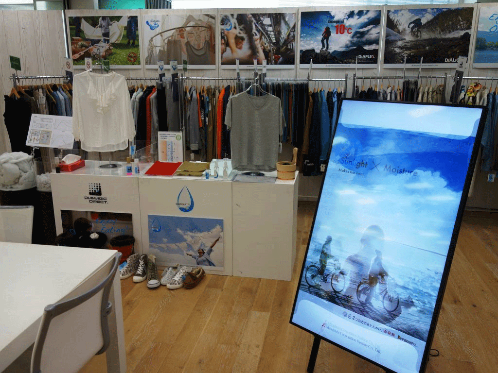 【東京本社】幾つかの商社が常設のショールームを構えるが、三菱商事ファッションもその一つ。たくさんの生地、製品サンプルが並んでいるが、展示してある商材の変化も感じる。特にシューズなど雑貨が増えているようだ。店頭で販売される商品が多角化していることが、ショールームの構成にも反映された。店舗の今後を映し出す存在としてショールームがあるとしたら、デジタルサイネージもそうだろうか。快適機能テキスタイルの特徴を、映像コンテンツでイメージさせる工夫もあちらこちらに見られた。(亮)