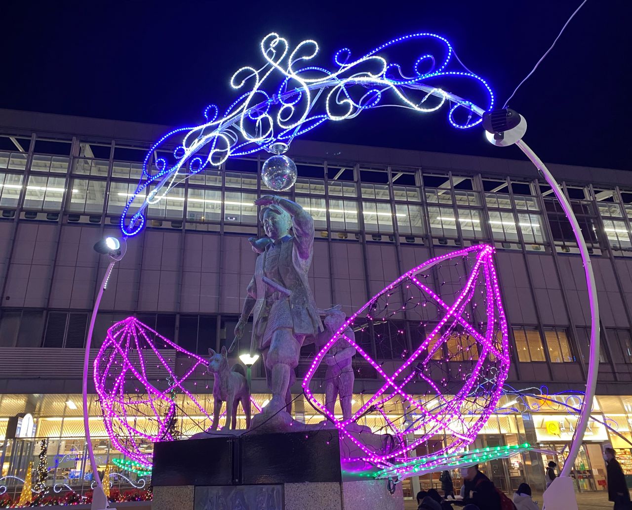 【中国・四国支社】JR岡山駅前のシンボル、桃太郎像。毎年この時期になると、同駅周辺をイルミネーションで彩る「モモタロウファンタジー」が開催され、電飾で華やかな姿に変わる。なぜか昨年には桃太郎の頭上にミラーボールが設置され、何とも言えない姿が会員制交流サイト(SNS)などで話題になっていた。企画者は新型コロナウイルス禍で暗くなったムードを少しでも明るくしたいとの思いがあったのかもしれない。今年もこのスタイルを踏襲。来年はこの桃太郎のように世の中が少しでも明るくなればと思う。(秋)