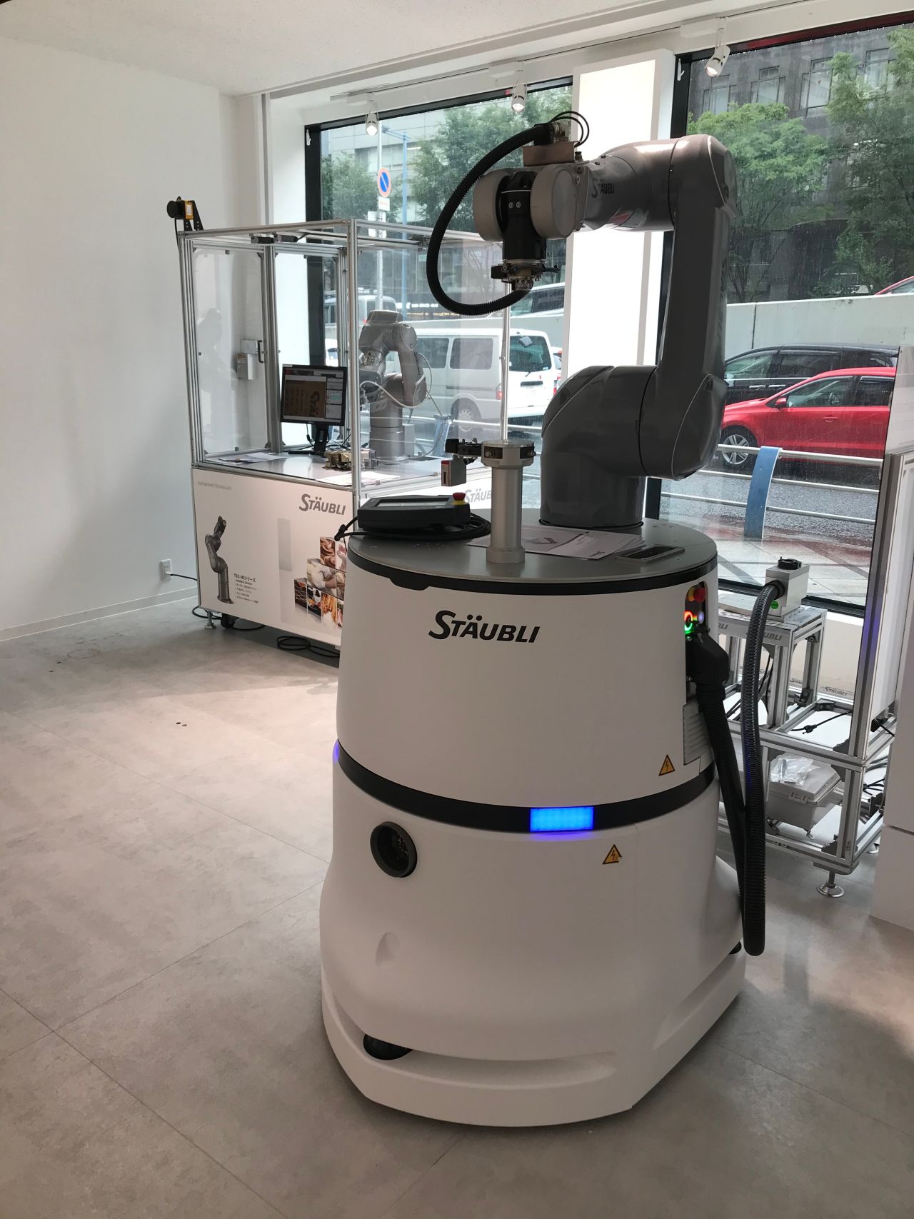 来場者が往来するなか、ぶつからないよう自走していた。安全柵が不要なので、人と作業場を区別する必要がない。人とロボットが肩を並べて仕事ができるというわけだ。