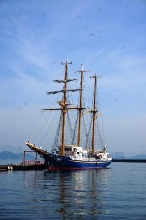 朝日に映える優美な姿に、しばしの間、見とれる。船名は「みらいへ」といい、一般人が乗れる国内唯一の帆船だという。今治には体験航海のために、まれに寄港しているようだ。