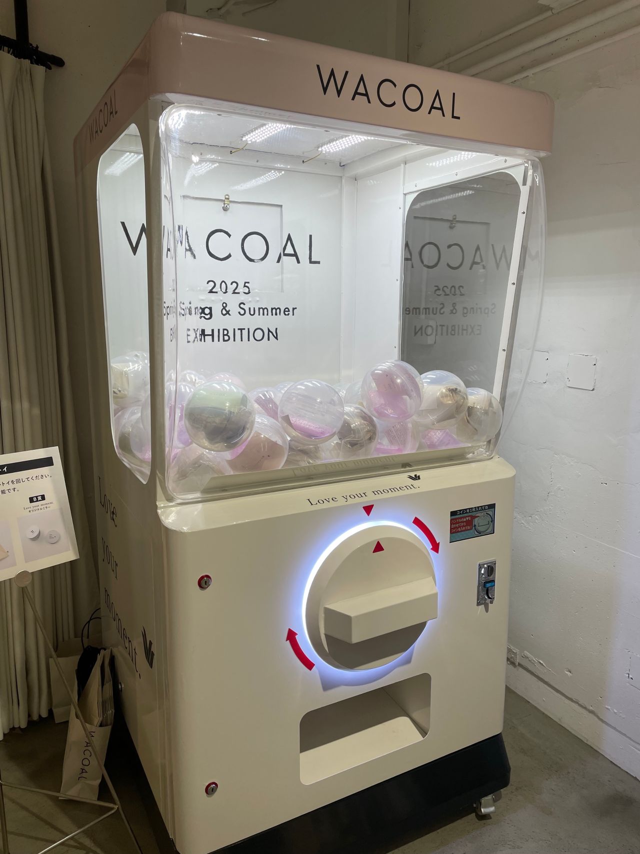 【東京本社】ワコールはこのほど、「ワコール」ブランドの展示会を開催した。同ブランドが社外に会場を借りて展示会を実施するのは久しぶり。「インフルエンサーらに同ブランドの商品を見てもらうことが目的」とし、ハグされているような優しい着け心地が特徴の「ハグするブラ」シリーズなどを中心に見せた。商品以外では大型のガチャガチャに目が止まった。回させてもらうとB賞のコンパクトミラーが当たった。年齢のせいか、不摂生のせいか、ストレスか、やたら吹き出物ができたり、口角炎になったりする。化粧はせずともミラーは結構ありがたい。(桃)