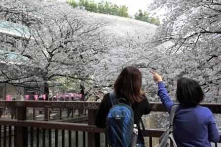 電車の車窓から見える川辺や、ビルの谷間の小さな公園など至るところで満開の花を楽しめる。写真はサクラの名所の一つ、目黒川沿い。東急田園都市線の池尻大橋駅へ向かう人が次々に足を止めて写真を撮っていた。