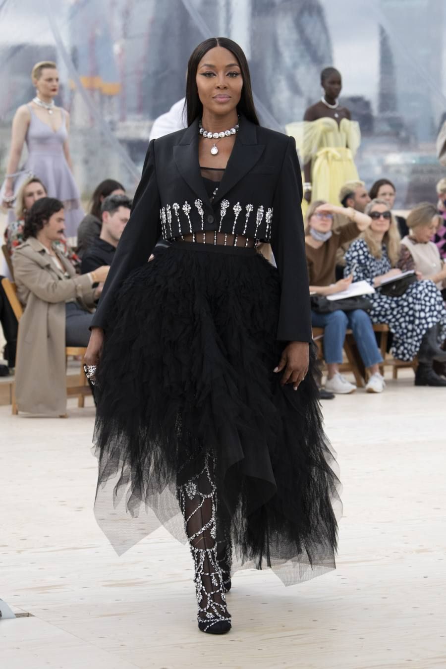 また、マイクロ丈のアビエータージャケットにチュールネットのスカートのコーディネート、デニムのチューブトップドレスとレザーのビスチエのレイヤードなど、パンクテイストも混ざり合う。モデルもストリートでハントしたかのような個性的な面々が登場(その中にナオミ・キャンベルも)。