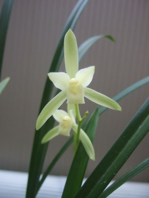 葉姿も寒蘭とよく似ているのですが、花型、着花数が異なり、汚れの無い緑白色、香りも良いものです。