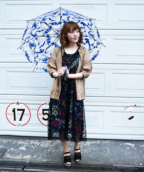カラフルかつクールな柄に重ねられた、ドットのチュールでエアリーに。