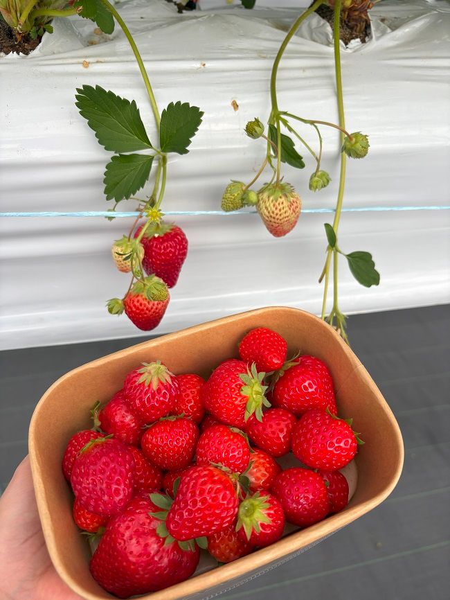 容器いっぱいに苺を詰め合わせて収穫していきます。
