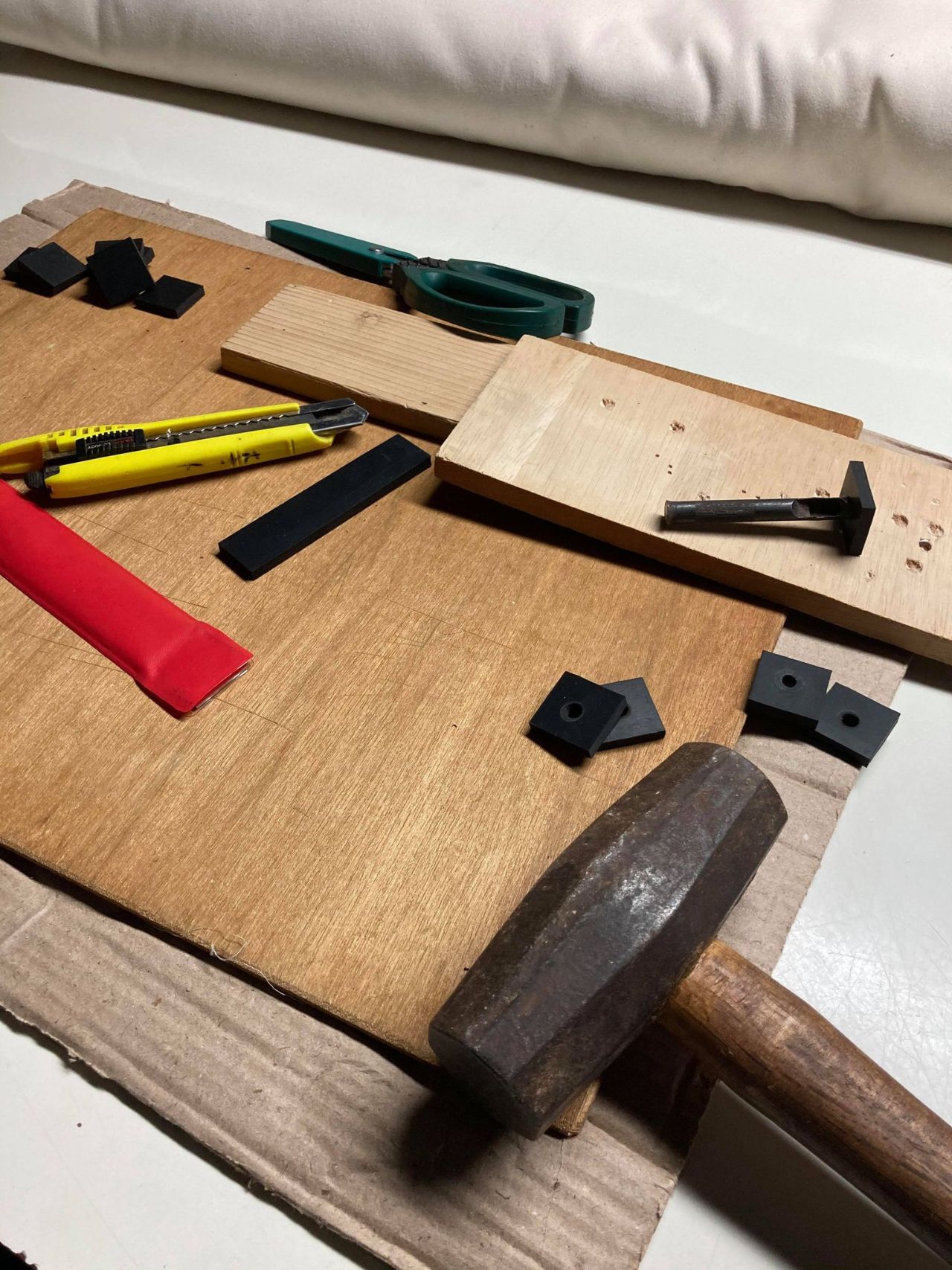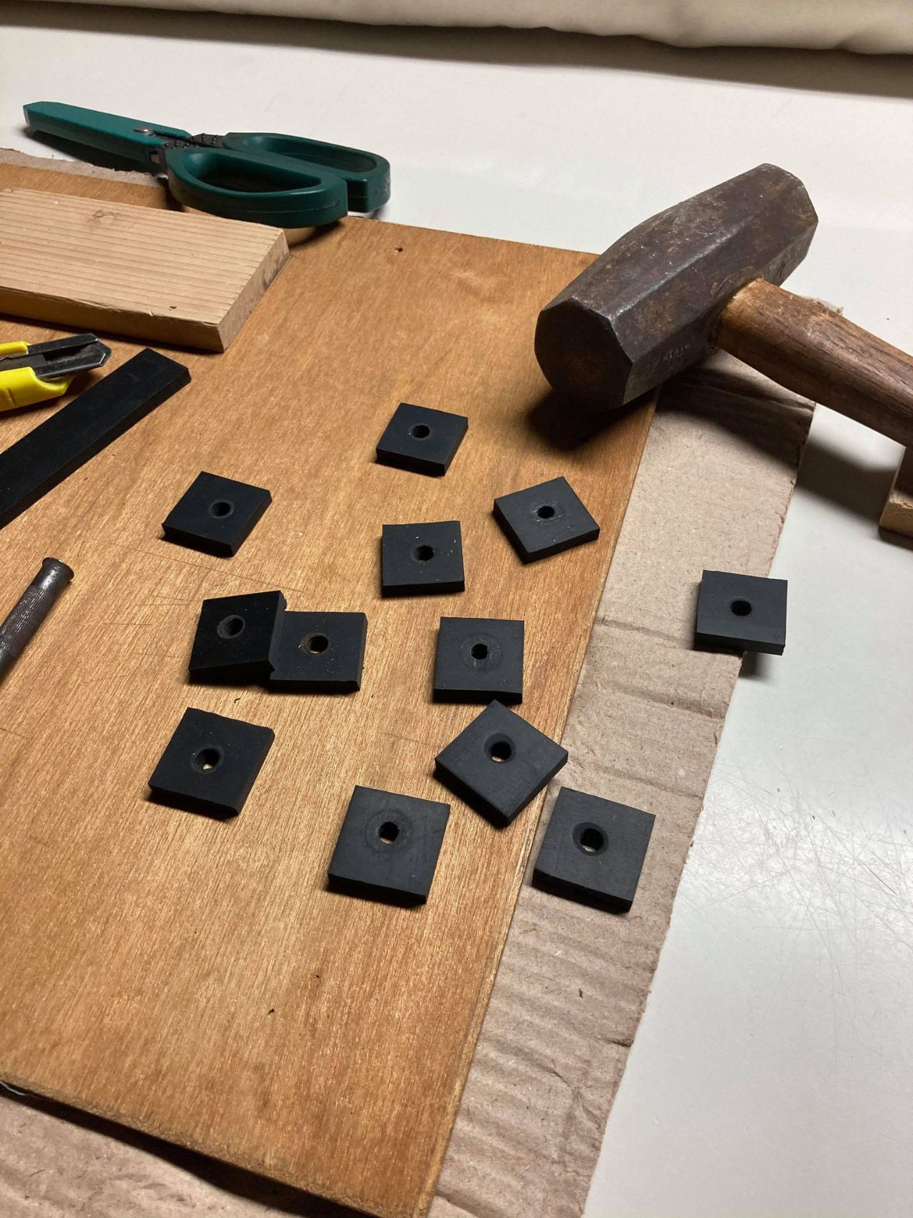 養生として緩衝材にゴムシート(序に、間隔キーパーとしても)